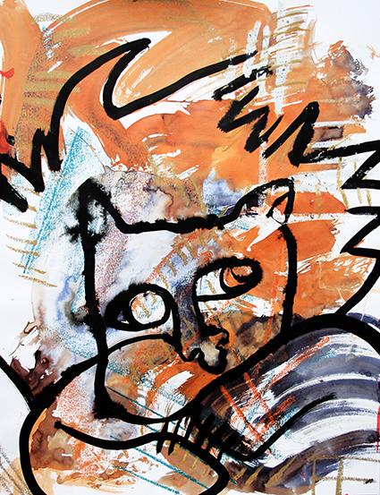La musique «live» et la présence des artistes exacerbe mon inspiration, je rentre dans une sorte de transe qui se lit dans le jeu des couleurs. Apparaît aussi un trait brut dicté par une écriture automatique.