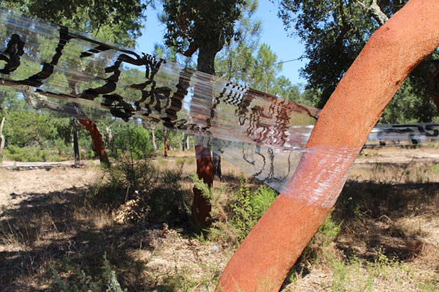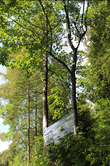 J’aime travailler sur la transparence au moyen du plastique. Ma volonté d’expérimentation m’a donc poussée à poser mon support de prédilection dans la nature. Il s’agit d’une feuille de Lexan© de 2mm d’épaisseur roulée sur elle-même mesurant 1,75m de haut et 1m de diamètre. L’installation est auto-portée et ne nécessite aucune structure. L’encombrement au sol est de 1m2.